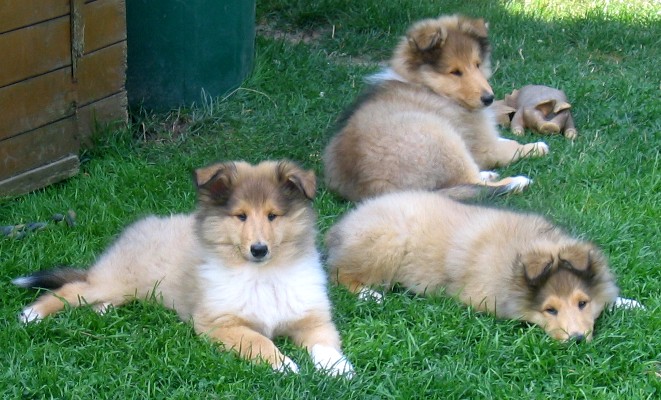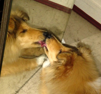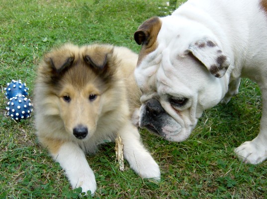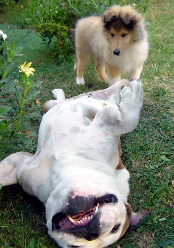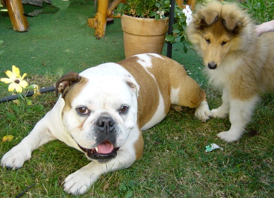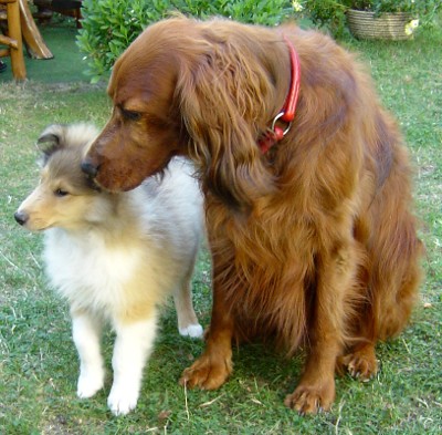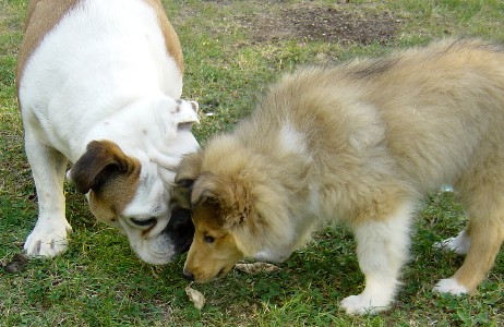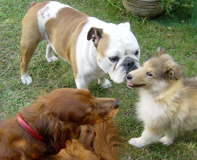 | Hitch zu Besuch bei seinen beiden Freundinnen: der Irish Setter Hündin Alina und dem Englischen Bulldoggenmädchen Butze. | "Da riecht es aber gut!" |